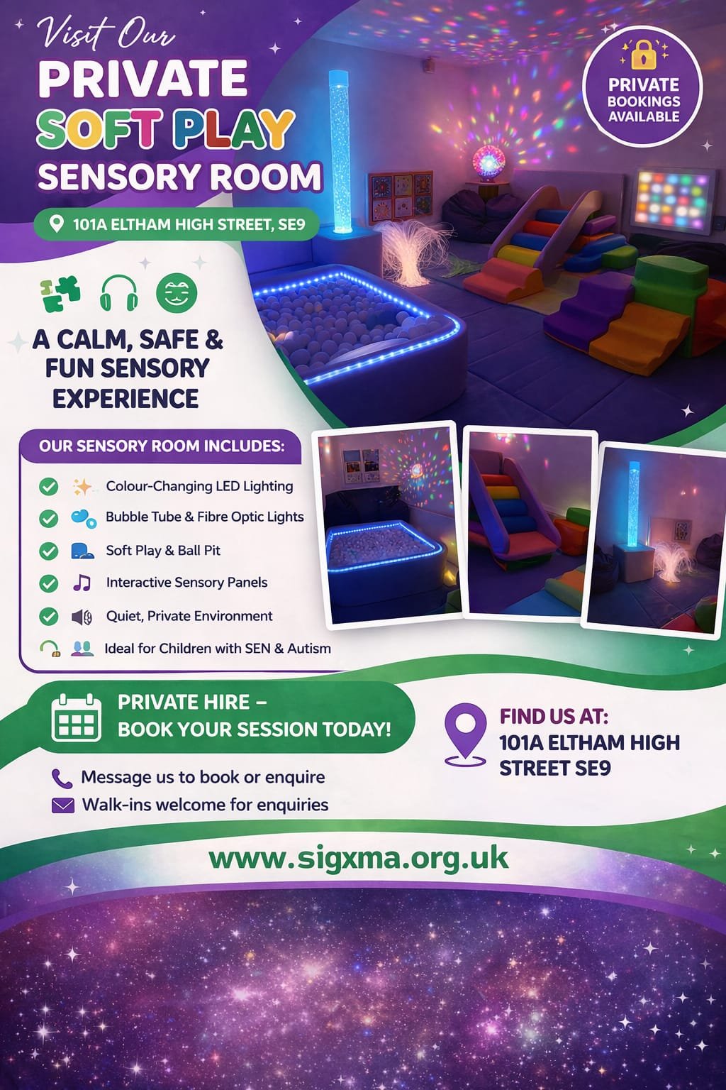 Our sensory room includes: Colour-changing LED lighting, bubble tube and fibre optic lights, soft play and ball pit, interactive sensory panels, and a quiet, private environment your child can truly relax in.